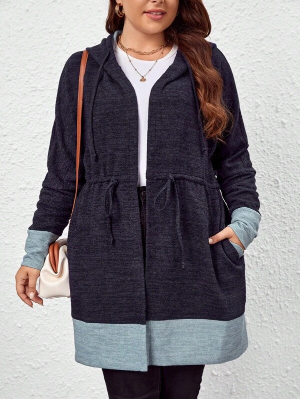SHEIN LUNE Plus Two Tone Drawstring Waist Hooded Longline Coat