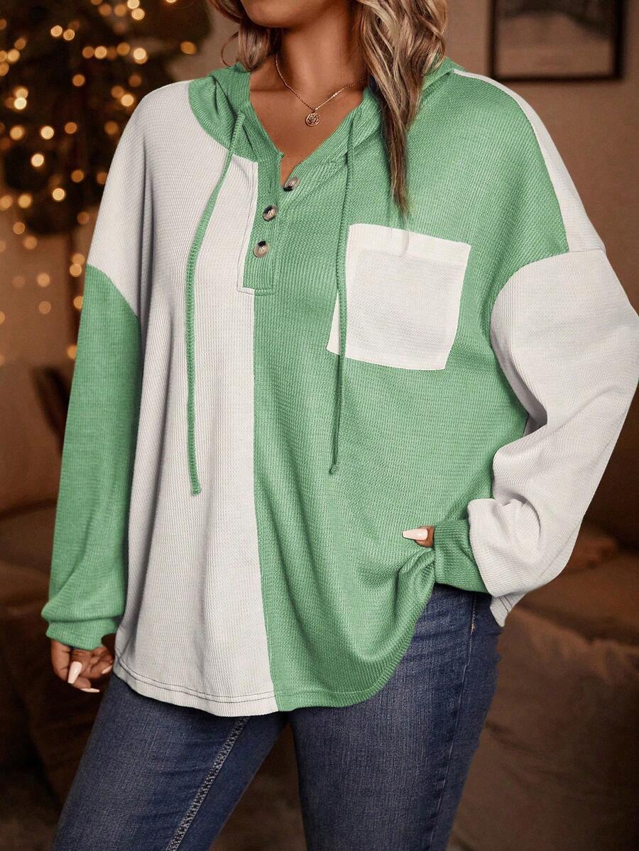 SHEIN LUNE Plus Two Tone Drop Shoulder Drawstring Hoodie