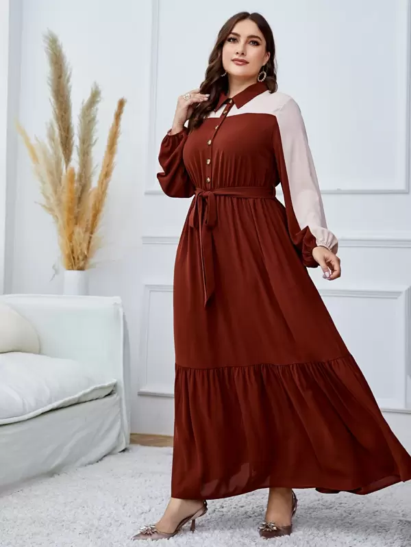 SHEIN Mulvari Plus Two Tone Ruffle Hem Belted Shirt Dress