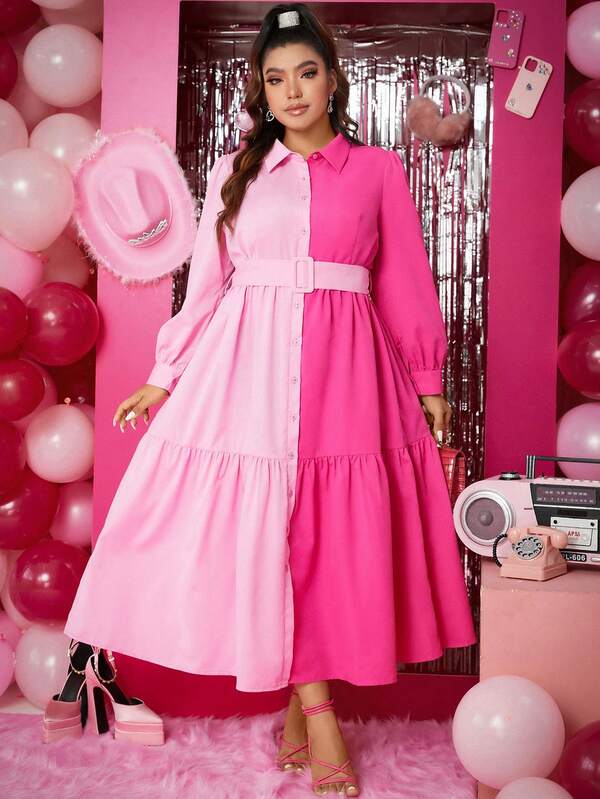 SHEIN Privé Plus Two Tone Ruffle Hem Belted Shirt Dress
