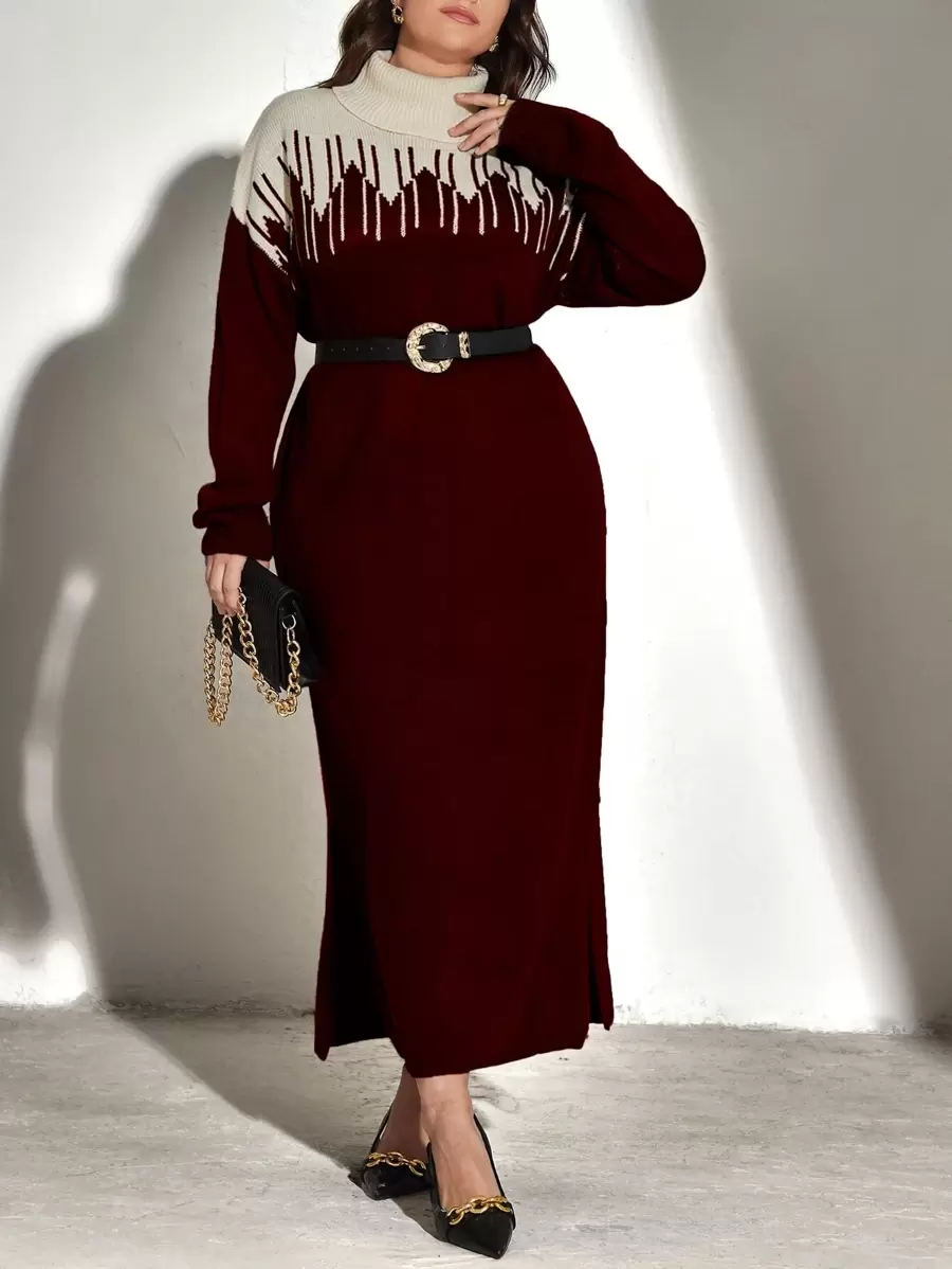 SHEIN Modely Plus Two Tone Turtleneck Drop Shoulder Split Hem Sweater Dress Without Belt