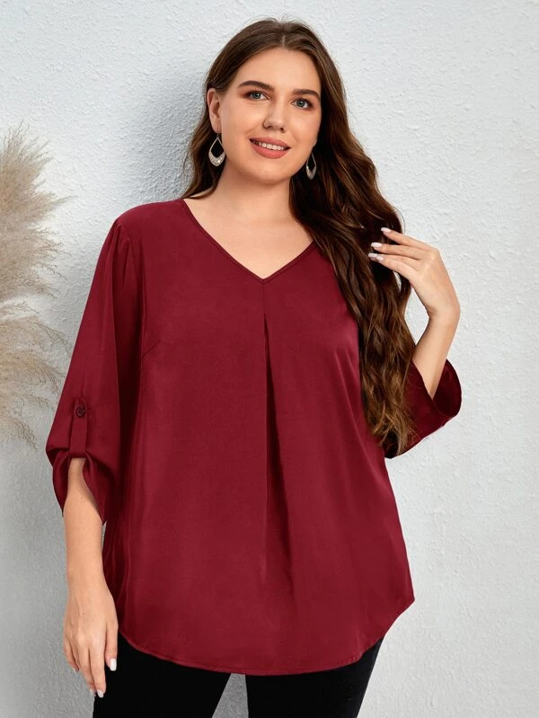EMERY ROSE Plus V Neck Roll Tab Sleeve Blouse