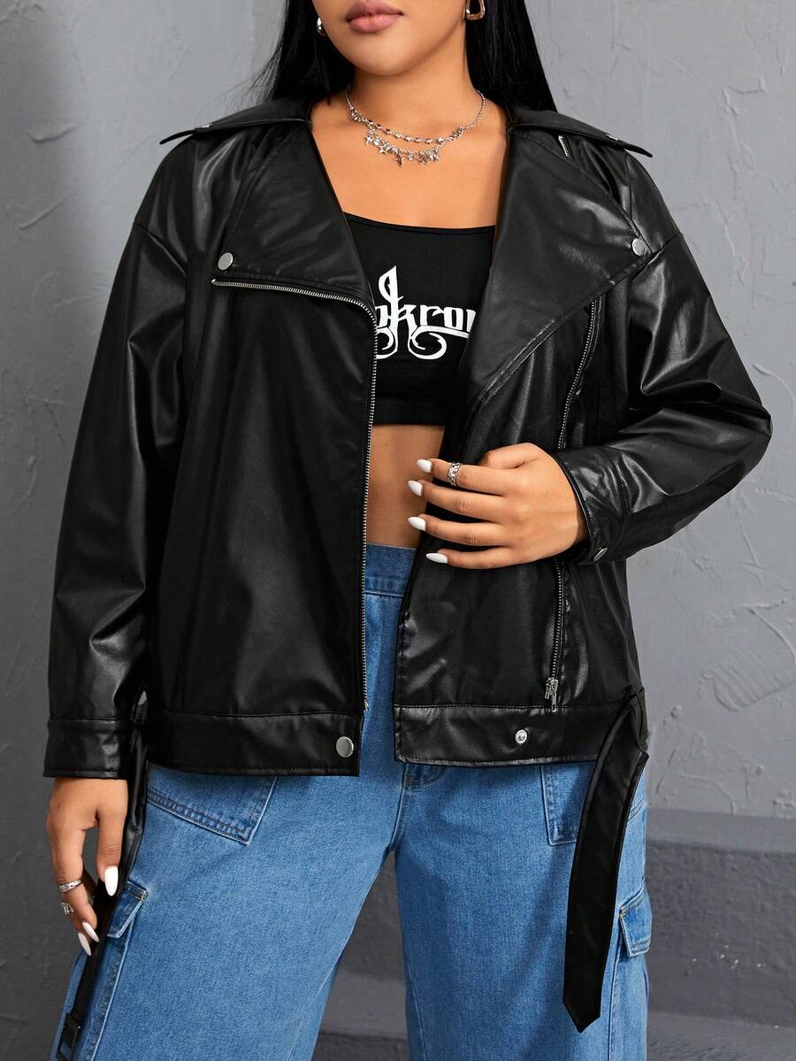 SHEIN Coolane Plus Zip Up Belted PU Leather Moto Jacket