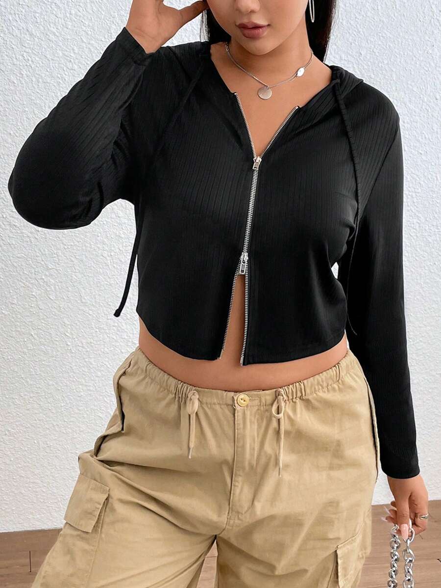 SHEIN EZwear Plus Zip Up Drawstring Hooded Crop Jacket