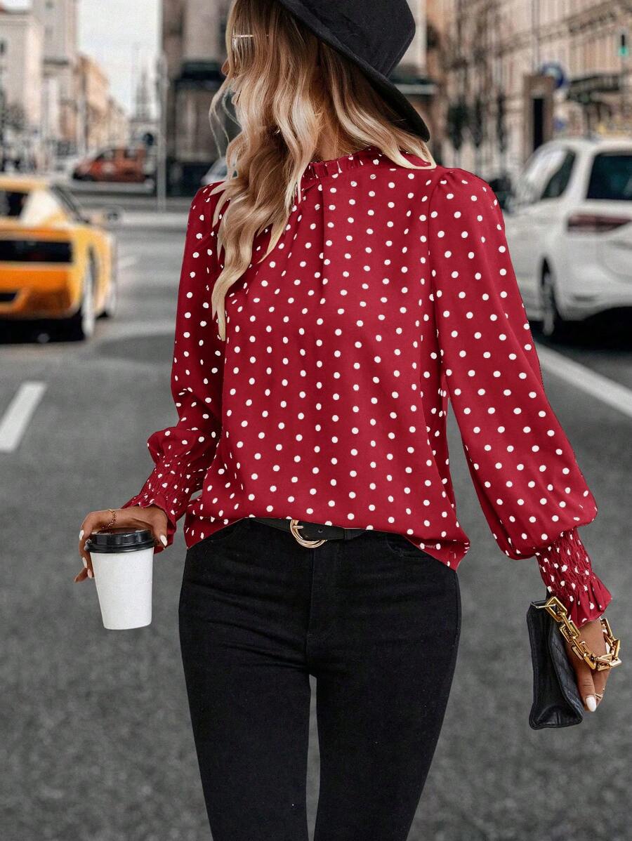 SHEIN LUNE Polka Dot Print Lantern Blouse Frill Trim Blouse