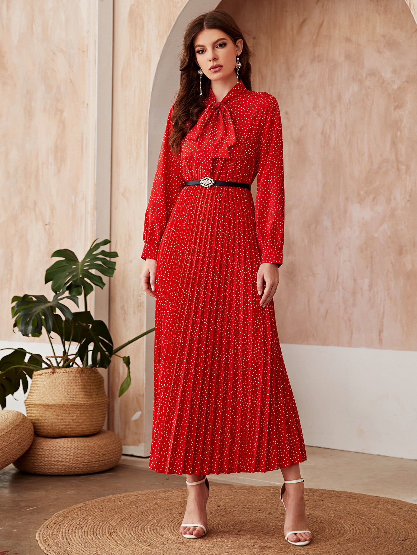 SHEIN Modely Polka Dot Tie Neck Belted Dress