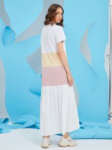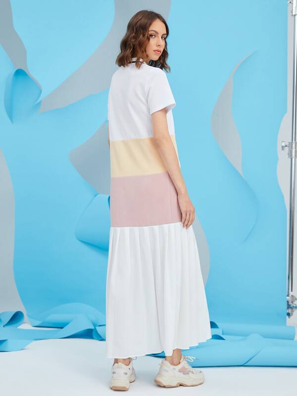 SHEIN Mulvari Polo Neck Color-block Pleated Hem Arabian Dress