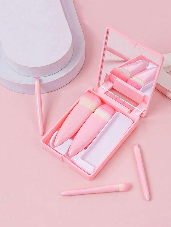 Portable Makeup Brush Kit, 1Set Plastic Cosmetic Brush & Storage Box With Mirror Cosmetic Brush