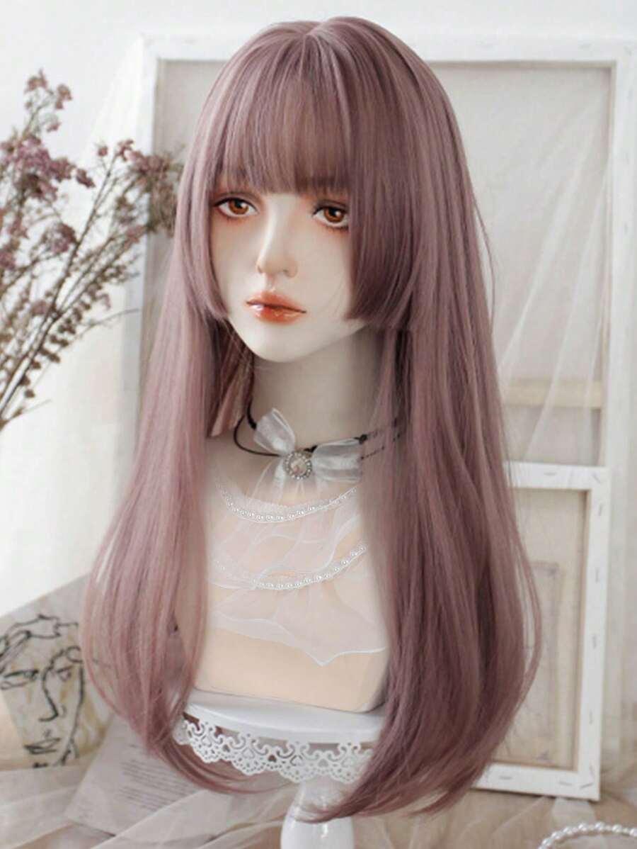 Princess Cut Long Straight Synthetic Wig with Bangs Dark Black Gray Hair Wigs for Women Cosplay Natural Hair Heat Resistant Layered Wigs