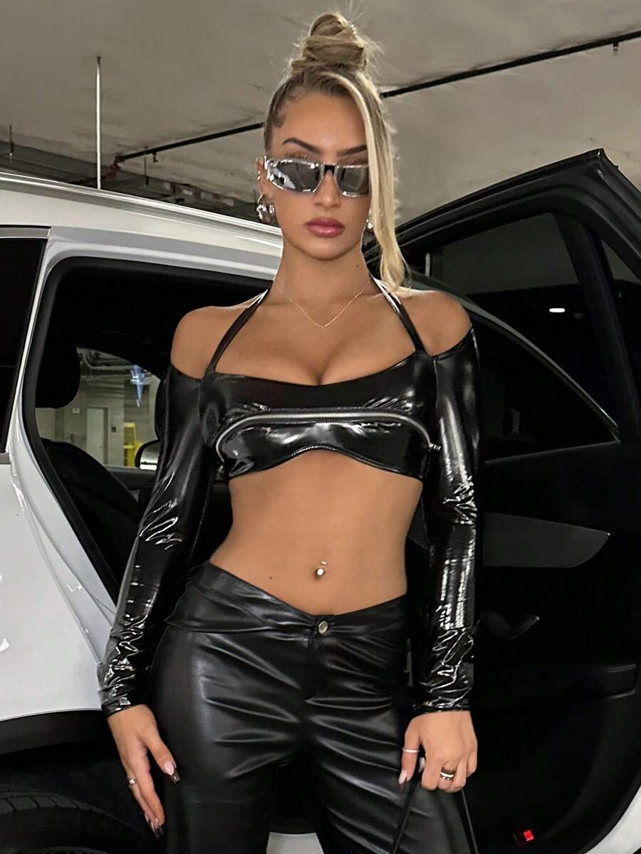 SHEIN ICON Pu Leather Halter Zipper Back Cropped Top