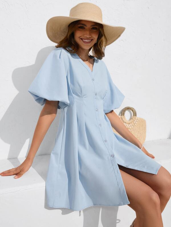 SHEIN VCAY Puff Sleeve Button Front Dress