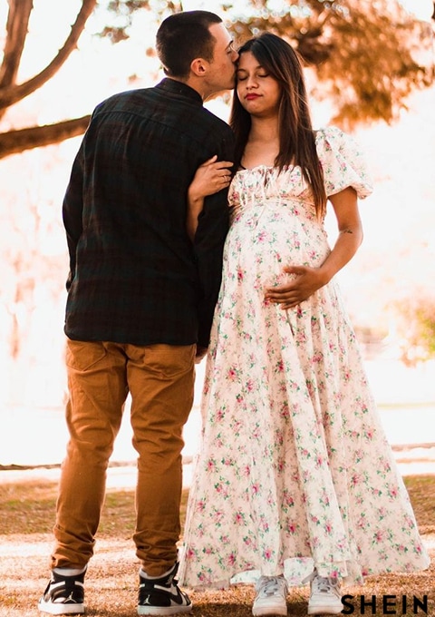 PARTHEA Puff Sleeve High Split Floral Print Dress