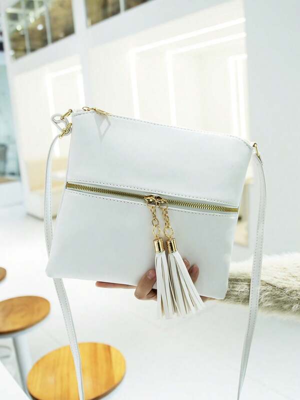 Pure Black Pu Zipper Design Elegant Crossbody Bag With Double Tassel Decoration Suitable For Shopping And Street Outfits