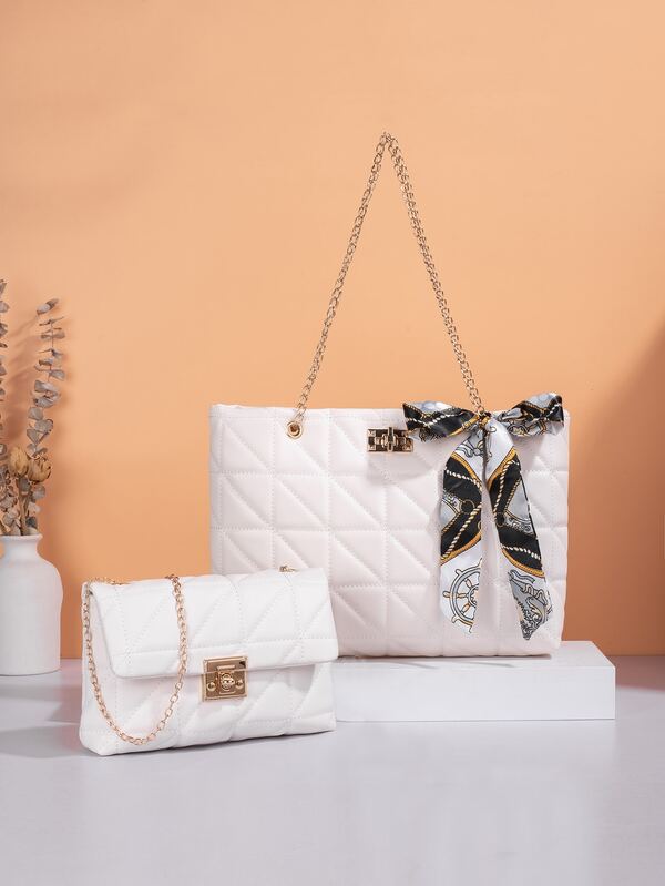 Quilted Twilly Scarf Decor Chain Shoulder Tote Bag With Square Bag, Best Work Bag For Women White-collar Workers,Teacher Teachers' Day,Outdoors, Travel, Outings,Shopping,Work ,Business,Commute