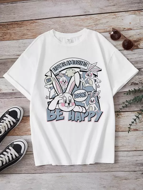 SHEIN EZwear Cute Style Rabbit Ear Printed White Short Sleeve T-Shirt For Women, Summer