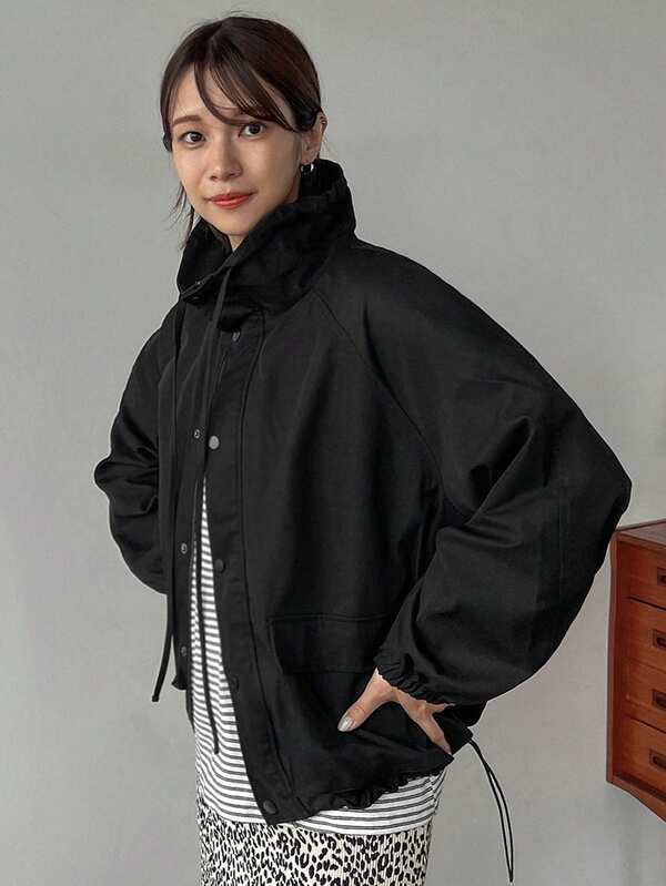 FRIFUL Raglan Sleeve Drawstring Hem Drawstring Hem Zip Up Snap Button Hooded Jacket