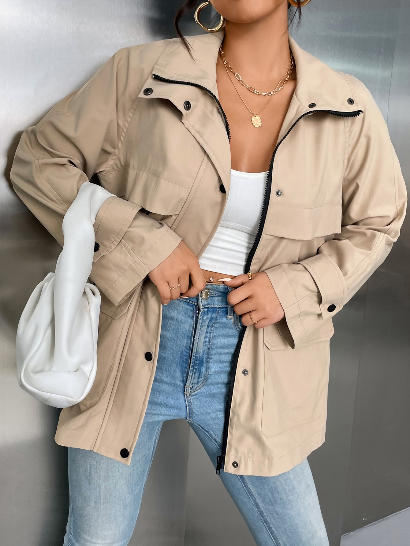 Raglan Sleeve Zip Up Snap Button Coat