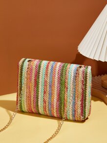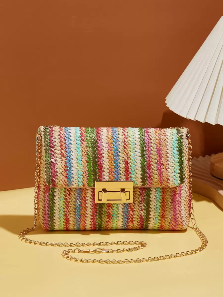 Rainbow Stripe Pattern Chain Straw Bag Fashion Retro Chain Shoulder Bag, Crossbody Bag, Women's Bag, Purse Bag Hasp Boho,Vintage straw bag Rainbow Color Woven Shoulder Bag, Colorful Flap Crossbody Bag, Women's Stylish Handbag & Purse