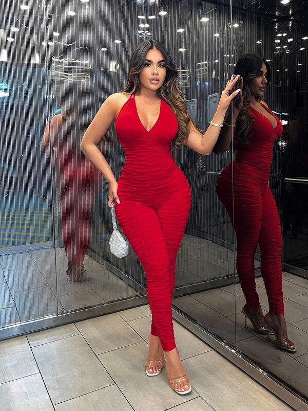 SHEIN SXY Red Gathered Suspender Jumpsuit