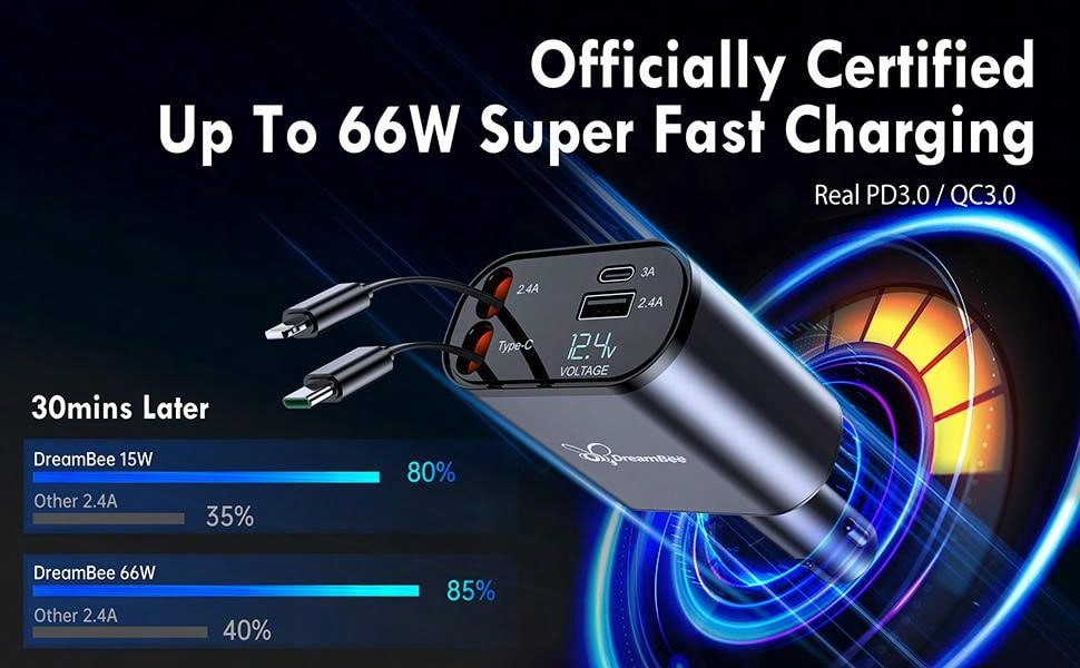 Retractable 4-in-1 Quick Charge Car Charger, 60w, Retractable Cable(2.6ft) And 2 Usb Ports Adapter, Compatible With Multiple Phone Models