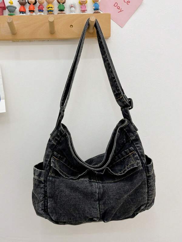 Retro Multi Pocket Denim Tote Bag, Casual Large Capacity Shoulder Bag, All-Match Girls Daily School Bag & Work Bag