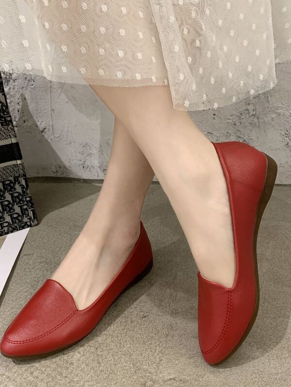 Retro Red Pointed Toe Shallow Mouth Single Shoes For Women In Autumn, Gentle And Casual Temperament, Soft-Soled Flat-Soled Granny Shoes, Women'S Single Shoes For Work And Commuting, Daily Wear