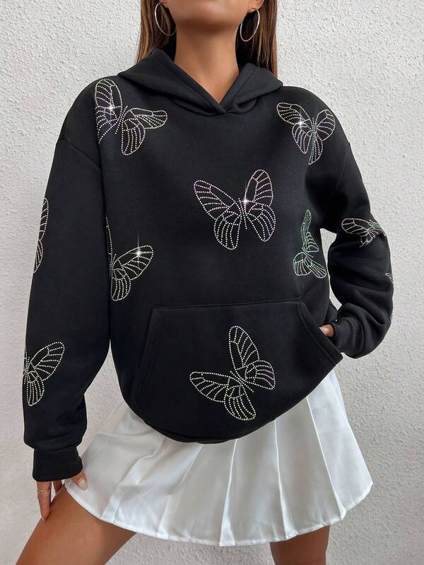 Rhinestone Butterfly Pattern Kangaroo Pocket Drop Shoulder Hoodie