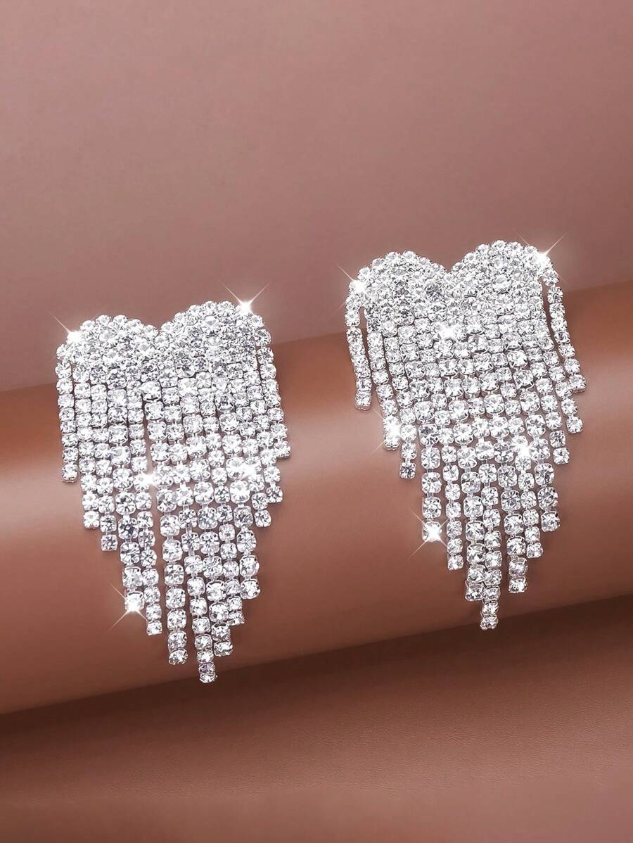 1pair Fashionable Heart Shaped Tassel Earrings With Rhinestone Decor For Women, Suitable For Party And Wedding