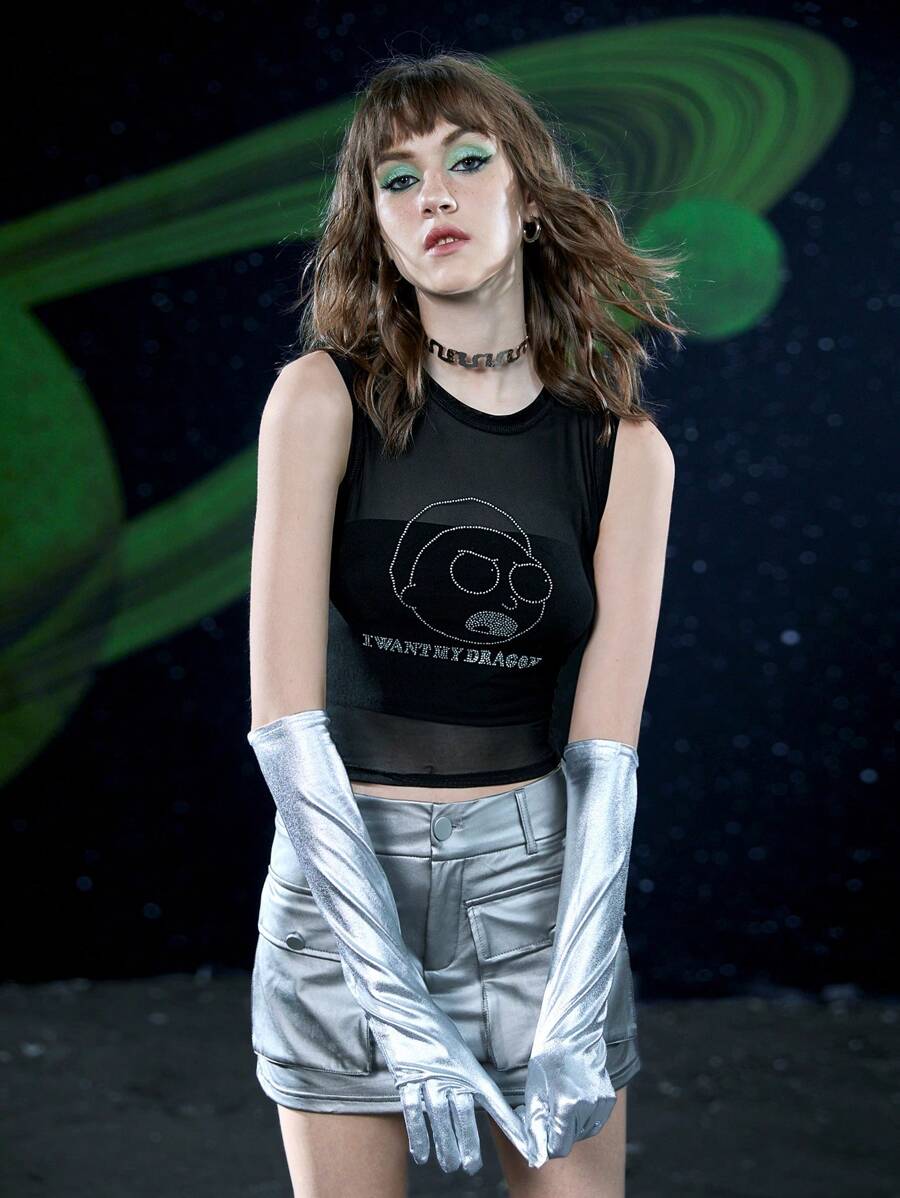 Rick and Morty X SHEIN Rhinestone Letter and Cartoon Pattern Mesh Tank Top Without Tube Top