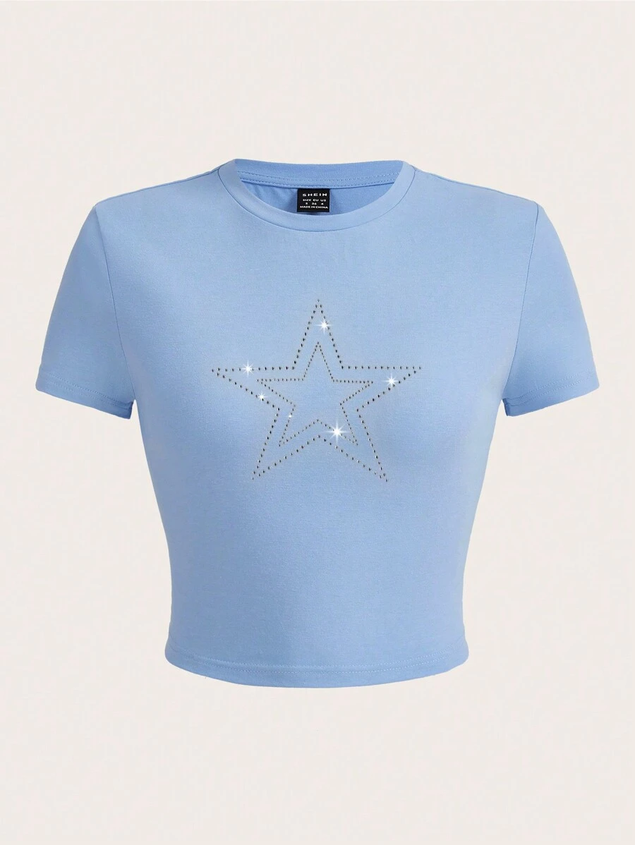 SHEIN EZwear Rhinestone-studded Five-pointed Star Design Short Sleeve T-shirt