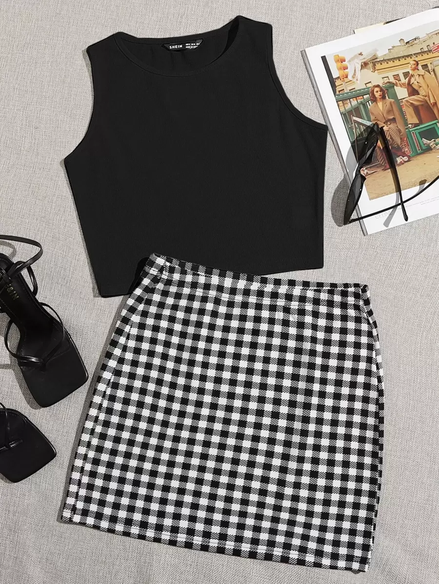 SHEIN Privé Rib-knit Tank Top & Buffalo Plaid Skirt Set