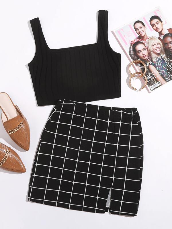 SHEIN Essnce Rib-knit Tank Top & Plaid Skirt Set