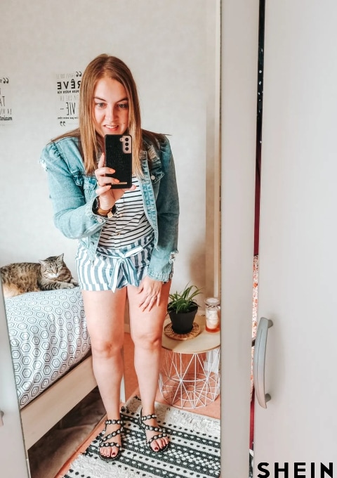 SHEIN VCAY Rolled Hem Self Belted Striped Shorts
