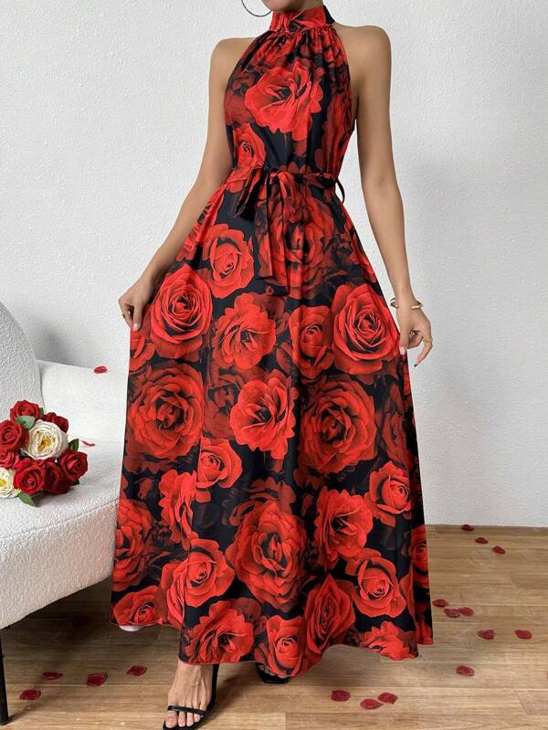 SHEIN Privé Rose Floral Printed Halterneck Maxi Dress