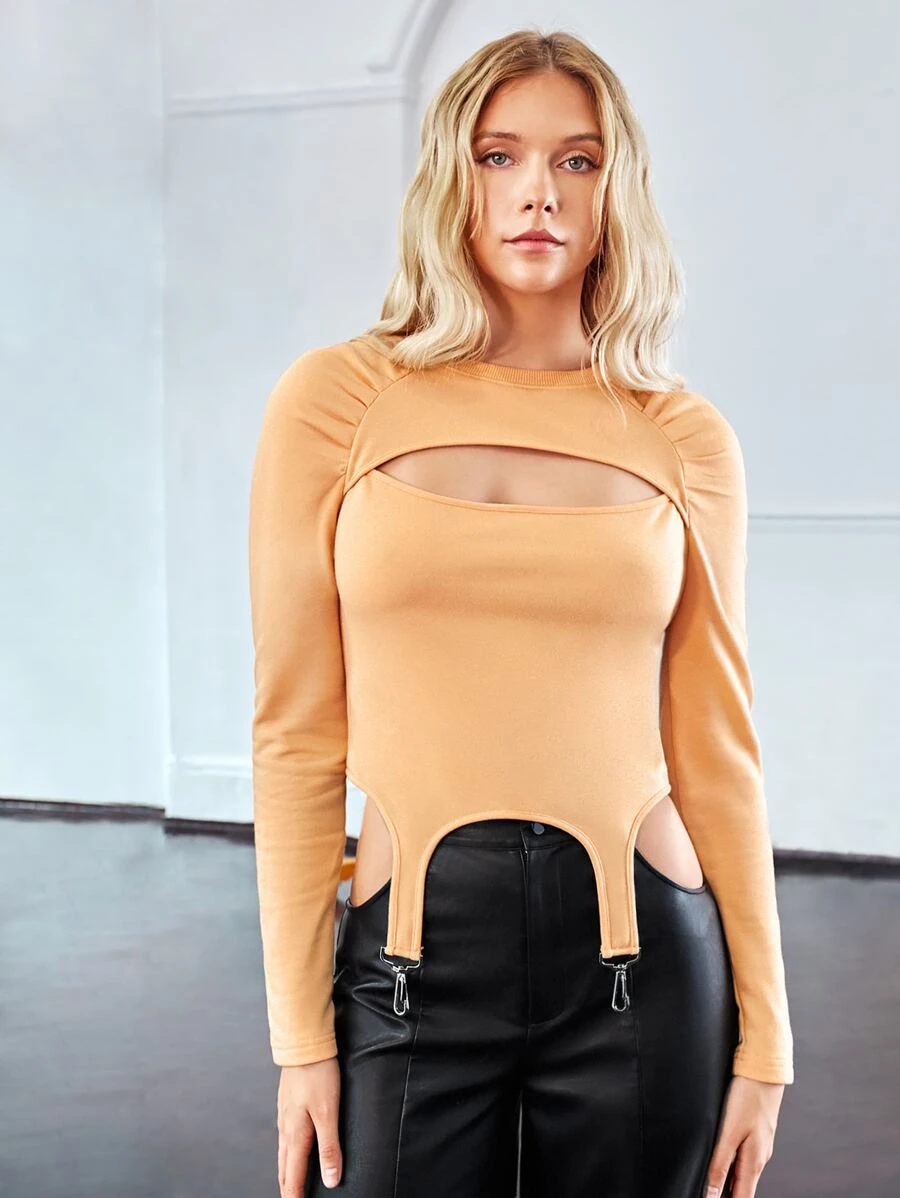 LUSINE BONFIELD Ruched Raglan Sleeve Cutout Front Asymmetrical Hem Tee