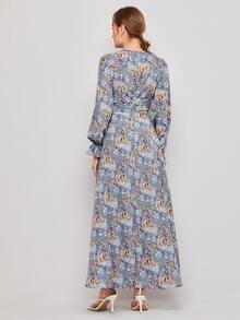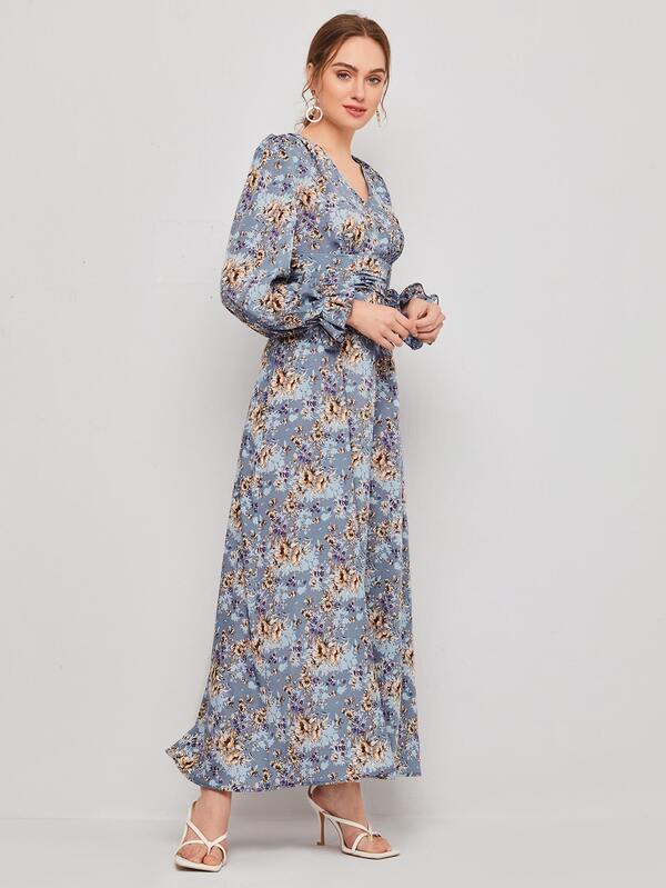 SHEIN Mulvari Ruffle Cuff Allover Floral Belted Dress