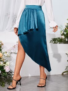 SHEIN Unity Ruffle Trim Asymmetrical Hem Satin Skirt