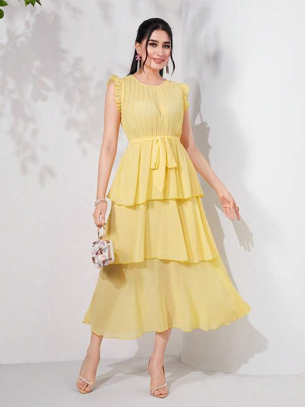SHEIN Mulvari Ruffle Trim Belted Layer Hem Dress