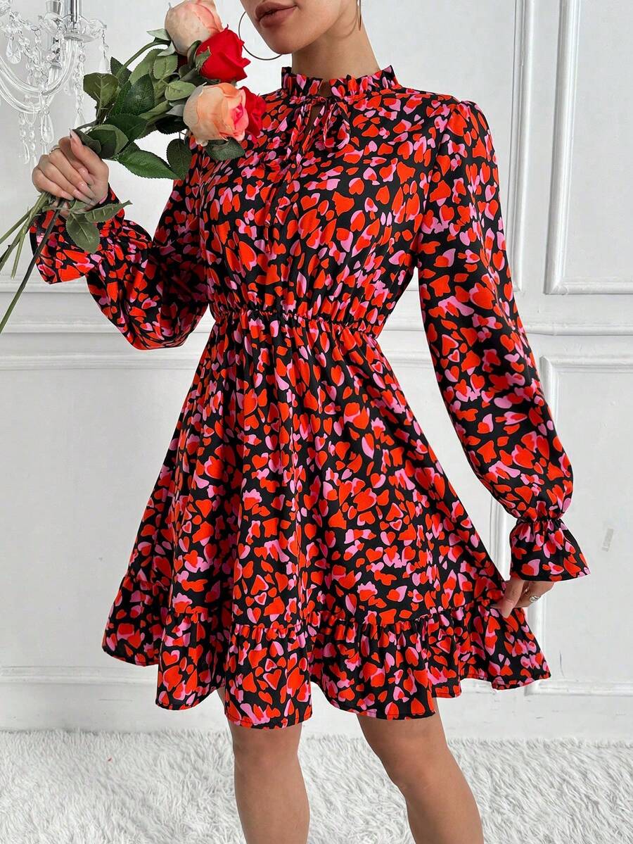 SHEIN Privé Ruffled Hemline & Love Heart Print Tie Collar Dress