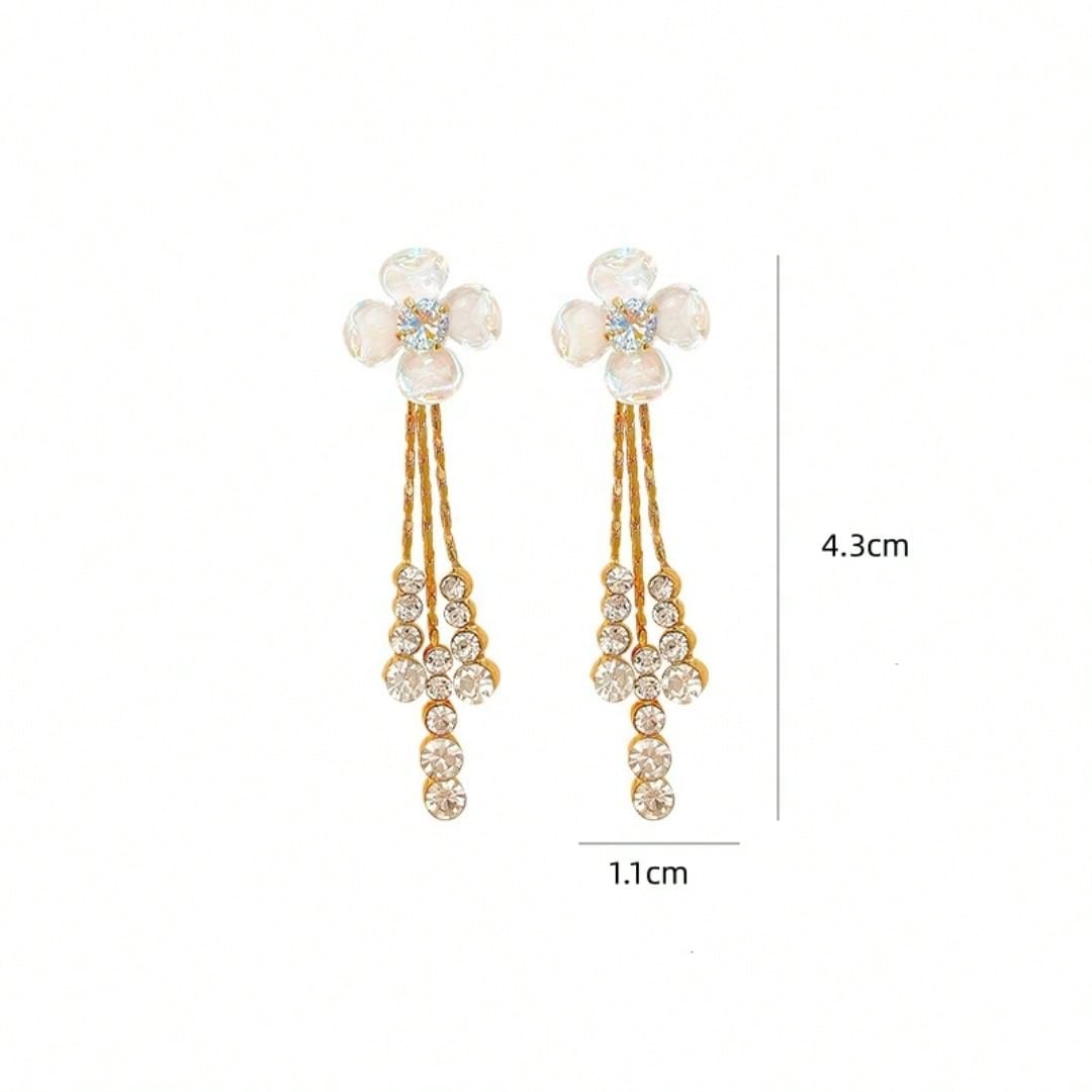 S925 Silver Post Valentine's Day Gift New Arrival Exquisite Long Flower Shape Tassel & Rhinestone Decor Drop Earrings For Women