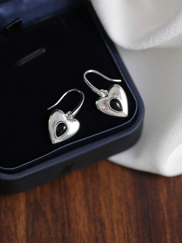 S925 Sterling Silver Vintage Black Agate Droplet &Heart Shaped Ear Hook, Korean-Style Heavy Work Dangle Earrings For Women
