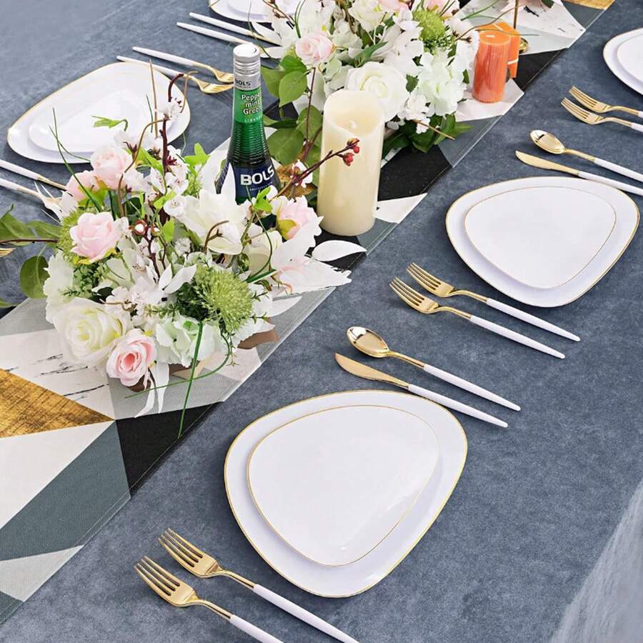 Set Of 10 Triangular Plates With Gold Rim Suitable For Fruits, Vegetables, Salads, Pasta And Desserts - Great For Dinner Parties And Table Decoration