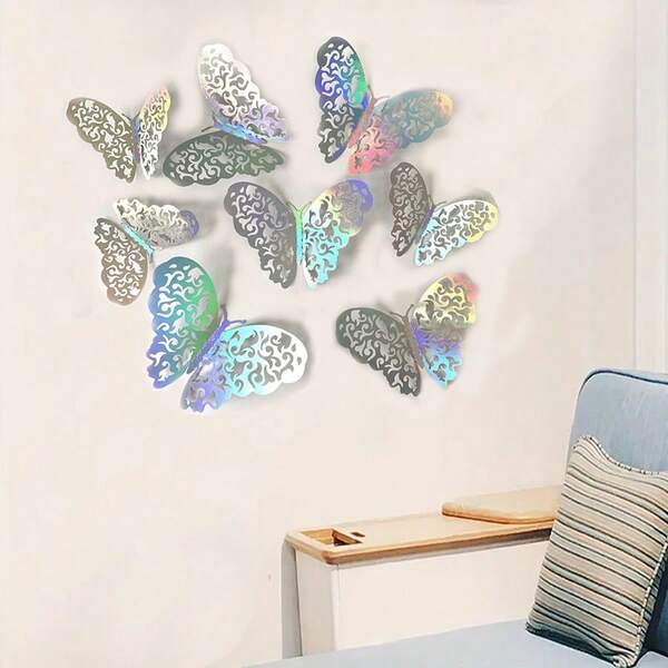 Set Of 12, 3D Colorful Silvery Butterfly Wall Sticker, Self-Adhesive Hollow Paper Three-Dimensional Decal For Living Room Bedroom, Wall Decoration, Home Room Decor