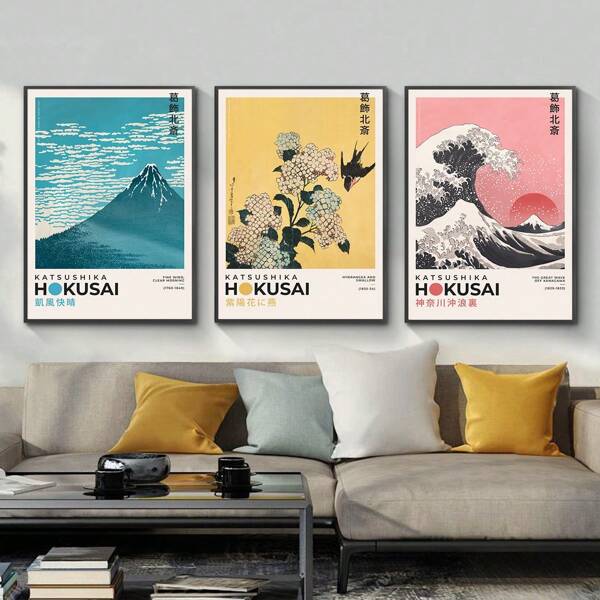 Set Of 3 Retro Japanese Scenery Art Prints, Japan Posters, Kanagawa Surfing Abstract Poster, Paintings Wall Art For Modern Living Room Decoration, No Frame