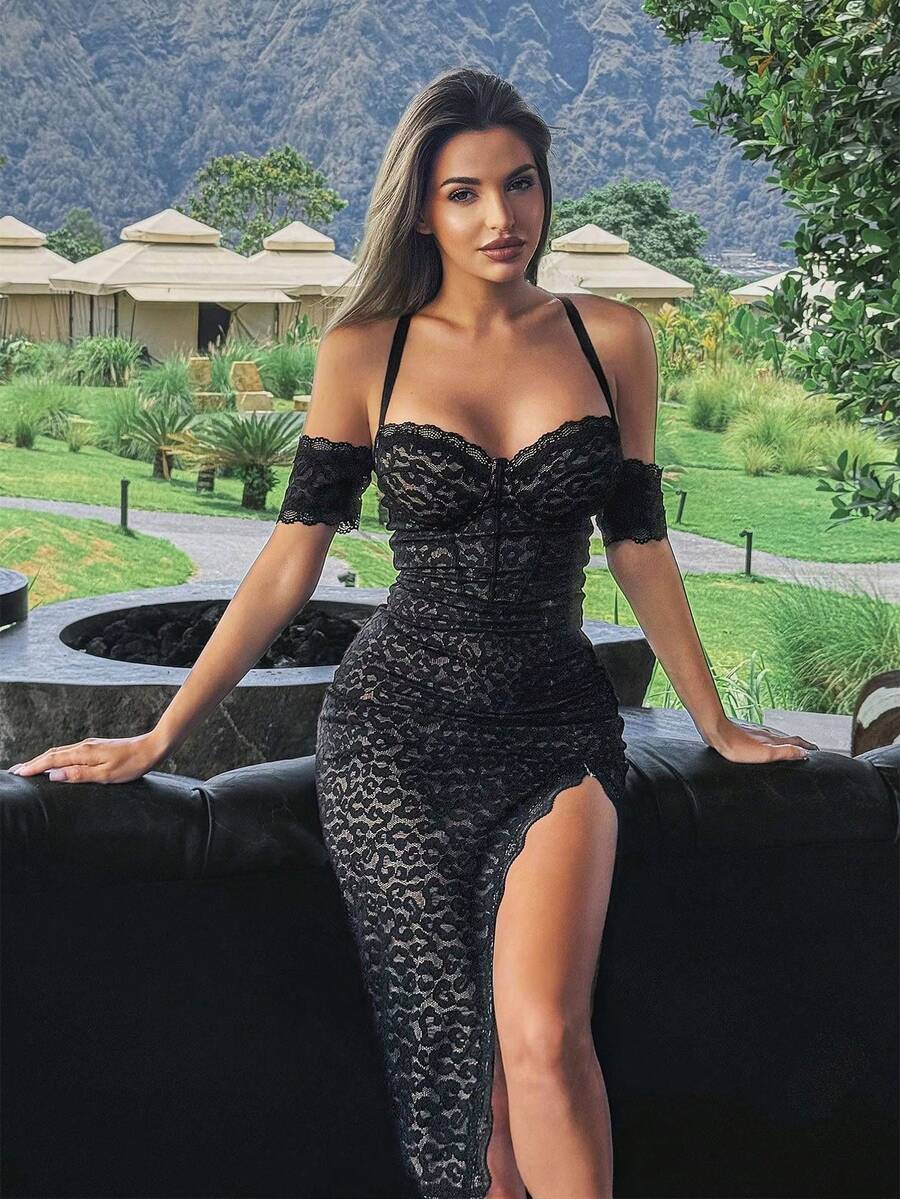 CurvySweet Sexy Fashion Black Leopard Lace High Slit Back Cross Spaghetti Straps Lace Stitching Midi Dress With Build-In Bra,Graduation White Dress,For Evening Date,Party,Festival,Anniversary,Nightclub,Vacation,Beach,Wedding,Christmas