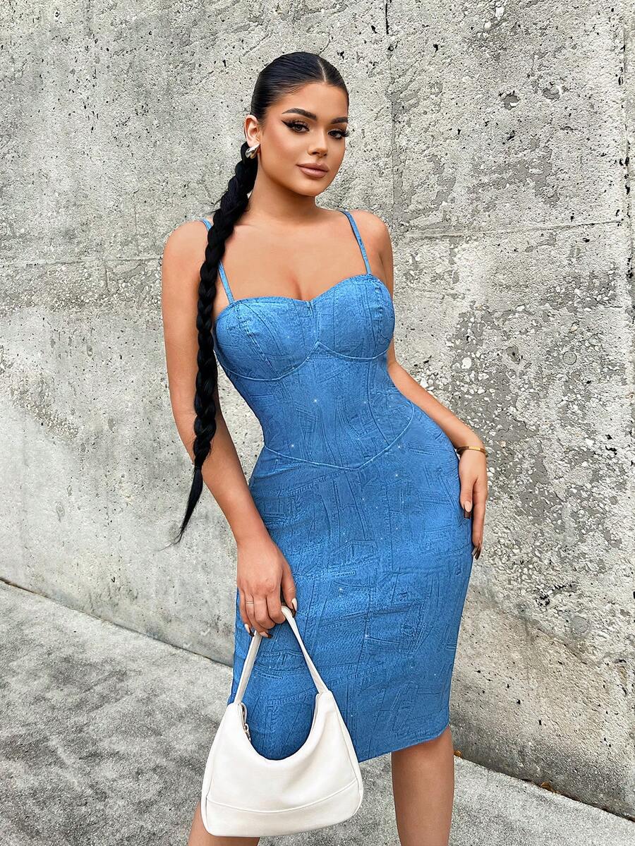 SHEIN SXY Shiny Fabric Imitation Denim Women'S Simple Spaghetti Strap Dress Birthday Outfit