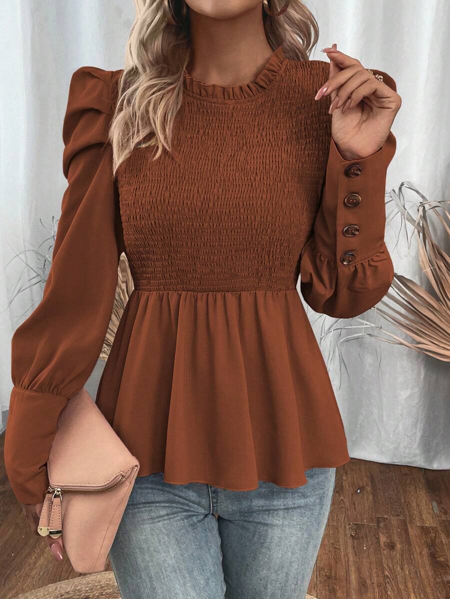 SHEIN LUNE Shirred Panelled Lantern Sleeve Blouse With Ruffle Hem