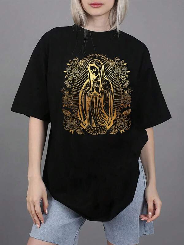 SHEIN Essnce Short Sleeve T-Shirt With Virgin Mary Pattern