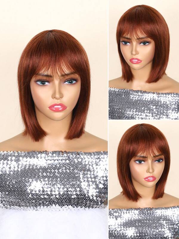 Short Straight Bob Colored Human Hair Wig With Bangs Coffee Brown Full Machine Made Hair Wigs