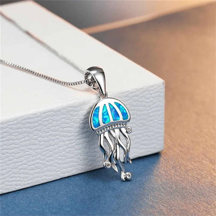 Simple Cute Blue Glitter Resin Inlaid Jellyfish Pendant Necklace Women's Animal Jewelry Wedding Engagement Accessories Gift